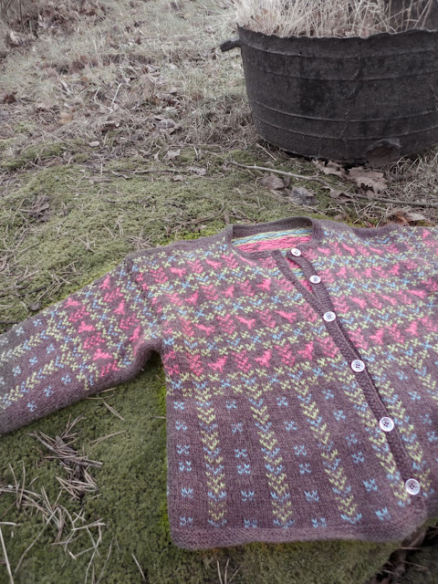 Särskilt förtjust är jag i färgerna, den bruna bottenfägen och de milda gröna blå och röda bårderna som är så fint anpassade till. Genom åren har jag stickat väldigt mycket med svart eller vitt som grund, men nu är jag trött på det och ska låta mig inspireras av det här färganslaget istället!